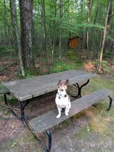 I brought Charlie with me on my Writing Hermitage, to keep me company. He is a stalwart morning alarm clock and evening intruder alarm. We hike every morning to shake out the muscle memory and indulge Charlie’s love of chasing chipmunks and birds. After all, this is a vacation for him as much as it is for me. Charlie is always ready to go chipmunk hunting. Yes, that's our outhouse way in the woods. It's not as horrible as you might think. 😉